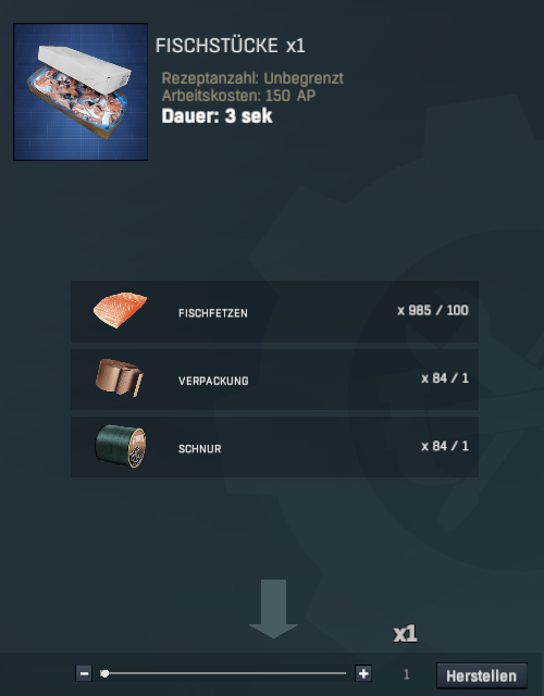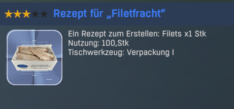 Pack ich die 100 Filets in eine Box, bekomme ich 3.722 Credits und einen Token. Bedenkt man, dass man pro Pack 250 Credits (fürs Rezept) abziehen muss, macht man mit jedem Pack Verlust, denn die 25 Token fürs Rezept müssen mit einberechnet werden.