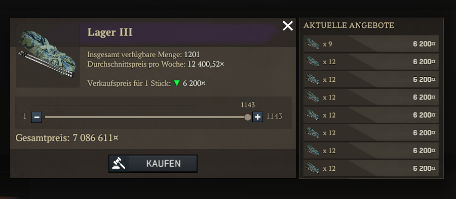 Ein User hat es anscheinend irgendwie hin bekommen 1200 "Lager III" zu generieren und irgendwie ins AH zu stellen. Und das zum halben Preis des üblichen Marktwerts. Als Resultat werden die Teile derzeit für unter 9000 Credits angeboten und der Preis für "Zelt im Paket" ist ebenfalls von ~130.000 auf 100.000 gefallen.