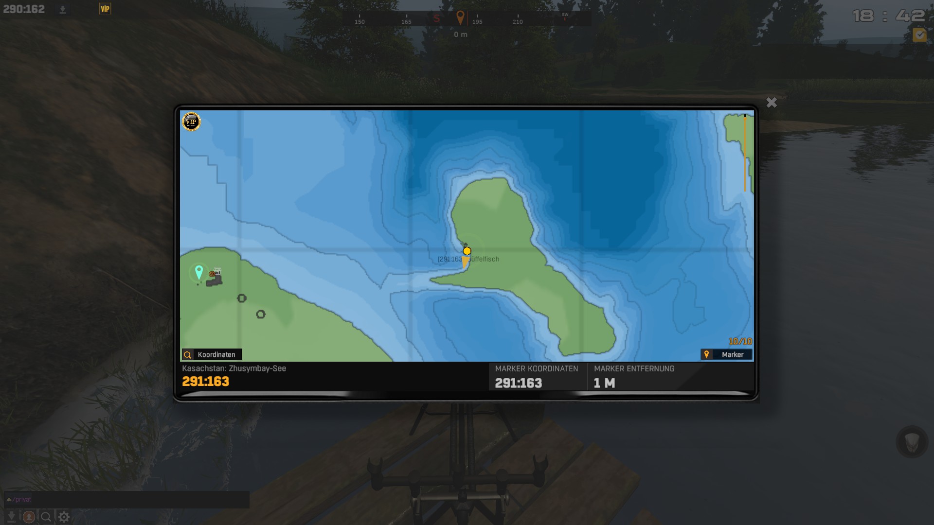 Der Spot ist 290:162 auf der Insel mit dem Turm.Und zwar auf dem Steg vorne links auf der Ecke. Auswurf geht mit einem Plumswurf richtung 195° in den 5 Meter tiefen Bereich. Als Köder funtioniert Grasbolie und Muschel bei mir.